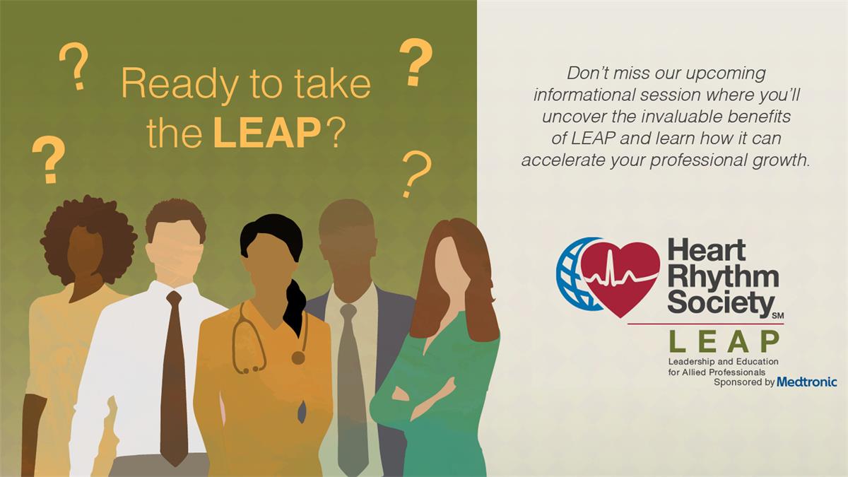 Get ready to take a leap forward in your career! Join us at the LEAP Informational "Happy Hour" during #HRS2023 and connect with former LEAP participants and program chairs. Hear their empowering stories, gain valuable insights, and explore how the HRS Leadership and Education for Allied Professionals program can supercharge your professional journey. Don't miss out on this exciting event to network, learn, and elevate your career!